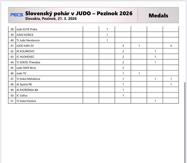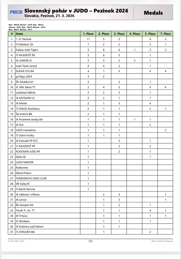 V sobotu (21.03.2026) sa v Pezinku konal 36. ročník medzinárodného turnaja v džude. Slovenský pohár, ktorého sa zúčastnilo 526 pretekárov zo 7 krajín a 56 klubov. Boje prebiehali medzi pretekármi z Česka, Maďarska, Ukrajiny, Rakúska, Gruzínska a medzi džudistami mnohých slovenských klubov. Judo Clubu AŠK-UCM Slávia Trnava sa predstavil pod vedením trénerov Ivany Komlóšiovej a Ivana Hrnčiara. Celkovo si náš klub odniesol jedenásť cenných kovov z toho dvakrát zlato, štyrikrát striebro, päťkrát bronz, deväťkrát bodované piate miesto a šesťkrát siedme miesto. V rámci súťaže družstiev z 56 prihlásených klubov obsadil Judo Club AŠK - UCM Slávia Trnava desiate miesto.